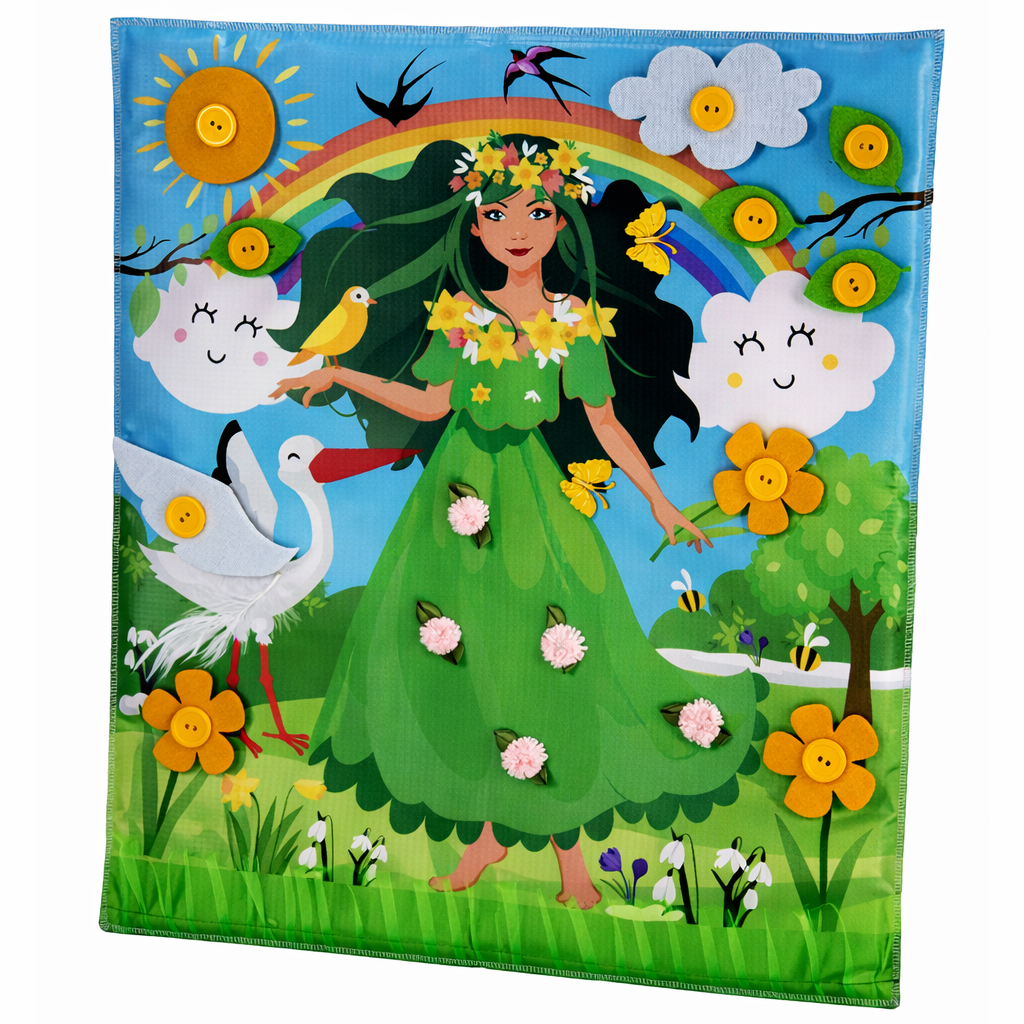 Ciekawa pomoc do ćwiczeń związanych z motoryką małą. Miękka, duża i atrakcyjna układanka związana z tematem wiosny. Złożona ze stałych kolorowych elementów oraz ruchomych, wykonanych z trwałego, kolorowego filcu. Ruchome elementy przeznaczone są do zapinania na guziki. Układanka może stać się świetną dekoracją sali. STałe elementy dostarczają dodatkowych wrażeń sensorycznych.