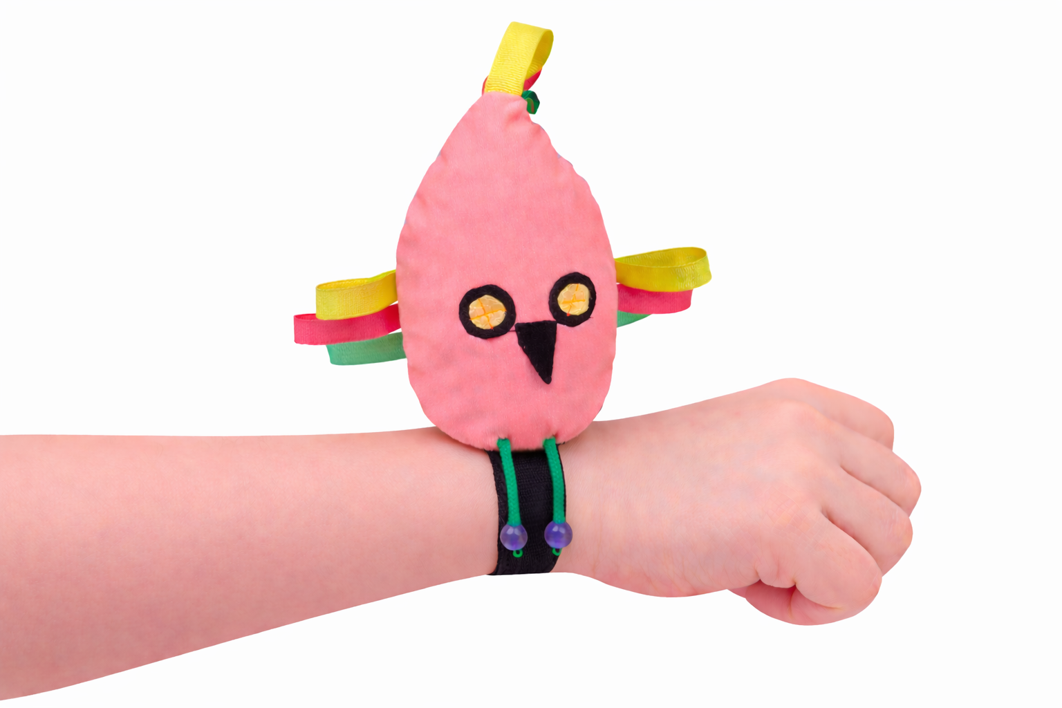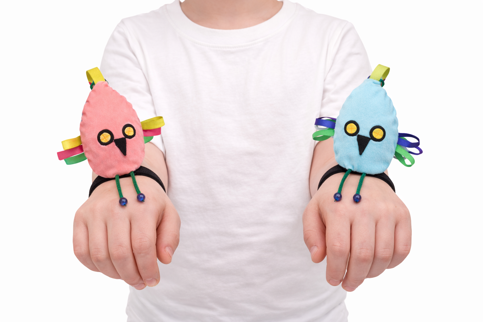 Dzięki wszytym gumkom, papugi można zakładać na rączkę – co daje dodatkowy efekt dociskowy, który wspomaga regulację napięcia mięśniowego i może działać wyciszająco.